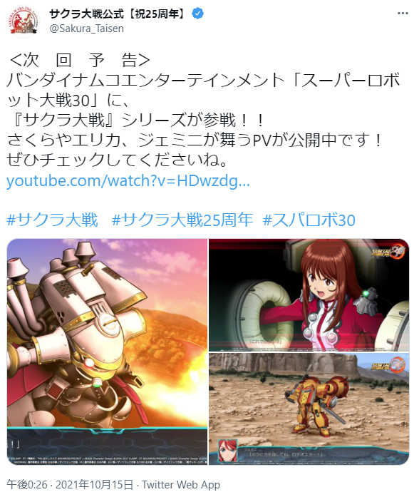 발표 직후에 트위터 일본쪽 트렌드가 떠들썩했던 모양인데요.자세한 소식은 이미 많이 전해졌을듯 해서 공식 트위터에서 한장만 가져왔습니다.https://twitter.com/Sakura_Taisen/status/1448852652062752770?s=20 반다이남코 엔터테인먼트 「슈퍼로봇대전 30」에,『사쿠라대전』 시리즈가 참전!!사쿠라와 에리카, 제미니가 활약하는 PV가 공개중입니다!꼭 체크해 주세요.저도 PV를 보고 왔는데, 예전에 합성사진으로만 보던 장면이 실제로 일어나니 얼떨떨하면서도 잘 실감이 나질 않는군요.오랫동안 참전이 이뤄지지 않았던 탓에, 3차알파같은 게임에서 사쿠라대전 출연진이 목소리를 맡은 캐릭터들을 소대에 넣고 공상 플레이를 할 수밖에 없었는데 드디어 실제 코부에 타고 나오는 주인공..